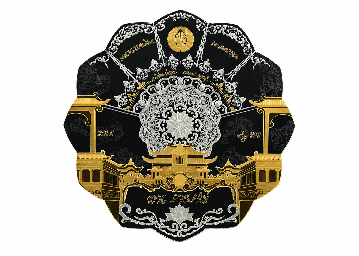 Монета отличается не только массой, но и техническими характеристиками. Ее диаметр составляет 160 мм, форма выполнена в виде двенадцатиугольника, а при изготовлении применены сложные технологии чеканки, золочение и вставки из полудрагоценных камней. Подобные параметры делают изделие уникальным не только для Беларуси, но и для мирового нумизматического рынка.