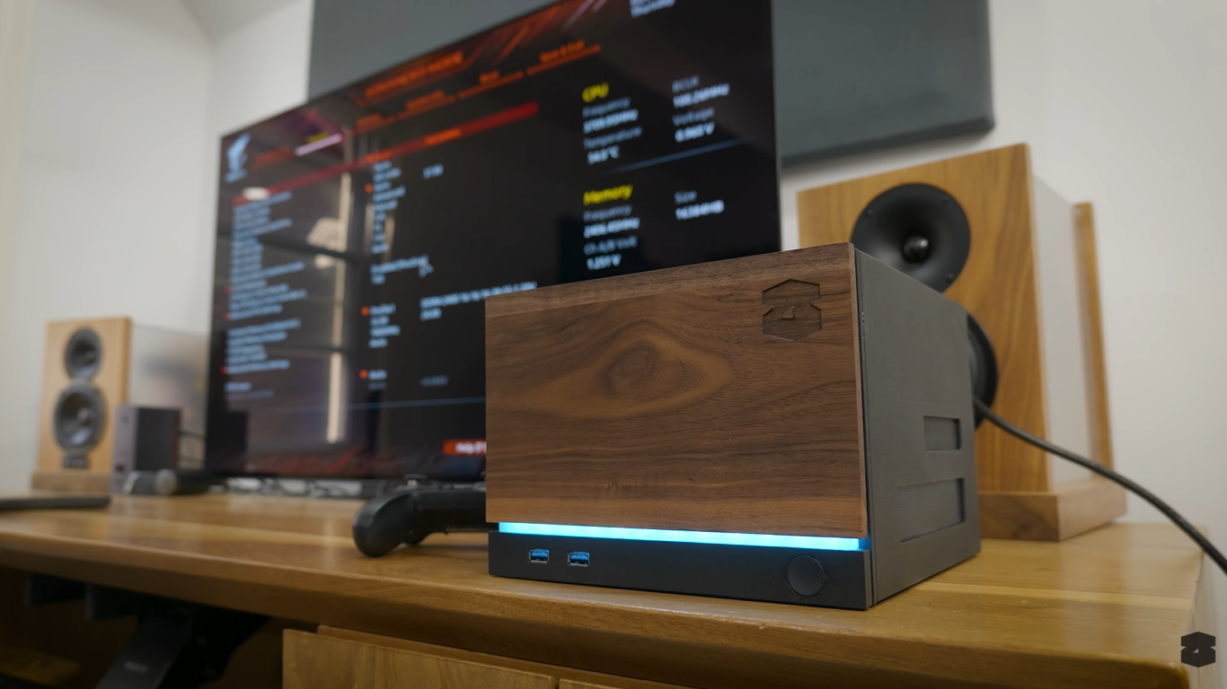 Корпус был спроектирован с нуля и получил передние USB-порты, световую полосу, магнитные накладки и деревянную фронтальную панель. В качестве операционной системы использовался Bazzite – Linux-дистрибутив, имитирующий интерфейс SteamOS. В тестах самодельная консоль выдавала 60 кадров в секунду в 4K в таких проектах, как ARC Raiders и Cyberpunk 2077, с применением технологий масштабирования.